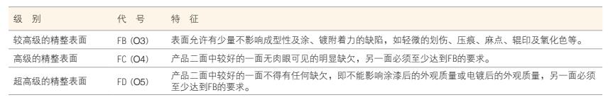 針對(duì)國內(nèi)鋼廠無法生產(chǎn)超高級(jí)精整表面質(zhì)量鋼板(O5板)的現(xiàn)狀,寶鋼積極組織生產(chǎn)、科研方面的人員大力攻關(guān),在國內(nèi)首先開發(fā)出了O5板這一冷軋精品,并實(shí)現(xiàn)了穩(wěn)定批量供貨,極大地滿足了汽車用戶的需求。目前寶鋼生產(chǎn)的低碳及超低碳鋼板不僅被廣泛地用于制作汽車的內(nèi)部零件,而且還被大量用作表面質(zhì)量要求高的轎車及客車等汽車的外覆蓋件。鋼板表面質(zhì)量分為三個(gè)級(jí)別,以滿足不同用途的要求。如下表所示: